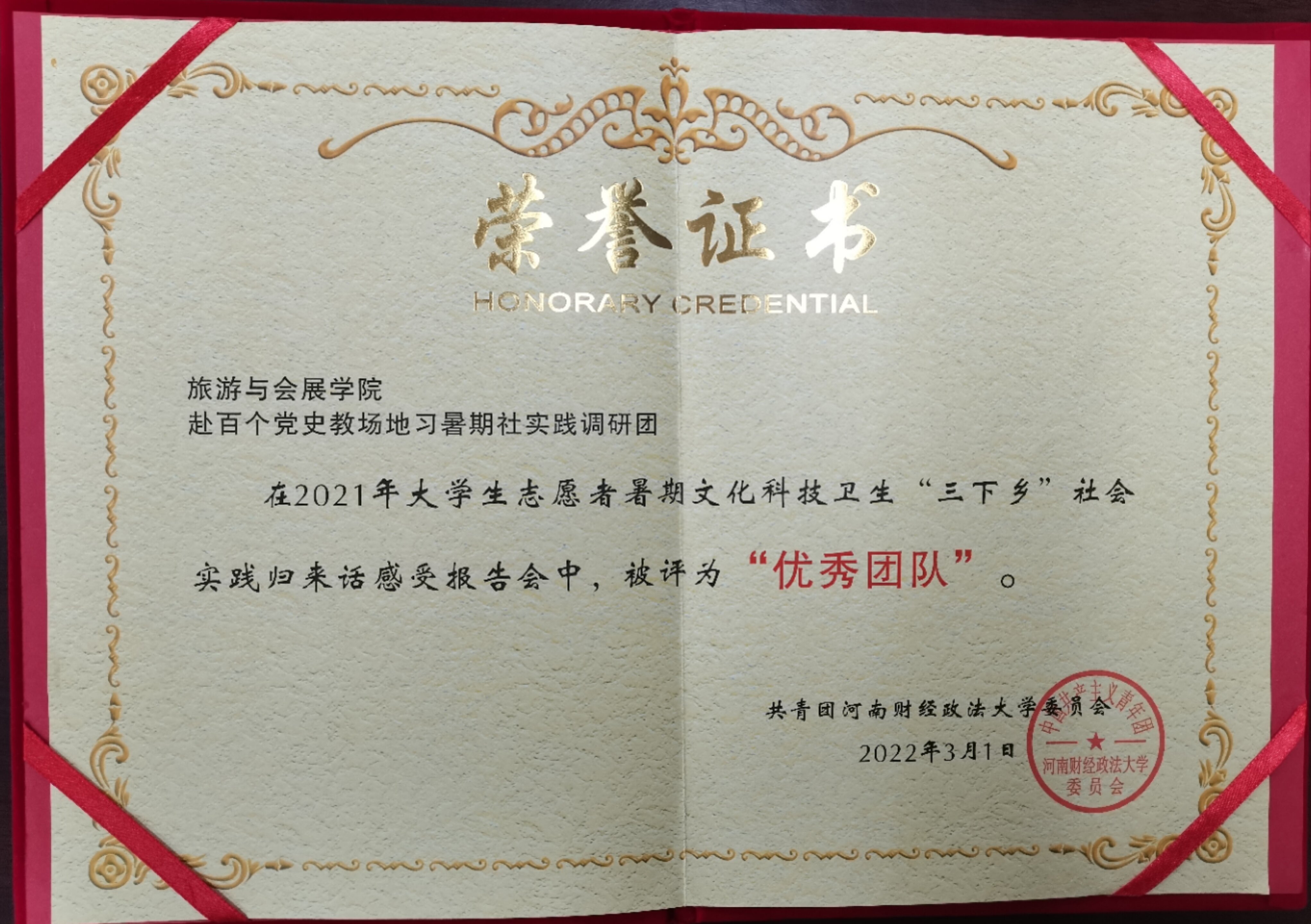 2022年3月1日,旅游与会展学院赴河南省百个党史教学场地暑期社会实践调研团在2021年大学生志愿者暑期文化科技卫生“三下乡”社会实践归来话感受报告中,被评为“优秀团队”。