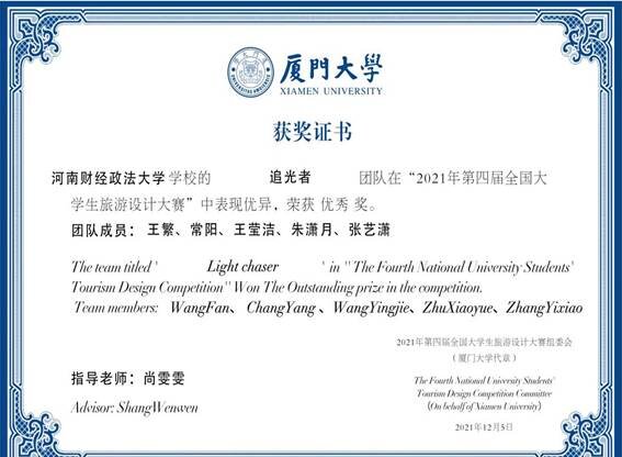 2021年12月,2021年第四届全国大学生旅游设计大赛圆满结束,我院由尚雯雯老师指导的“追光者”团队荣获优秀奖。