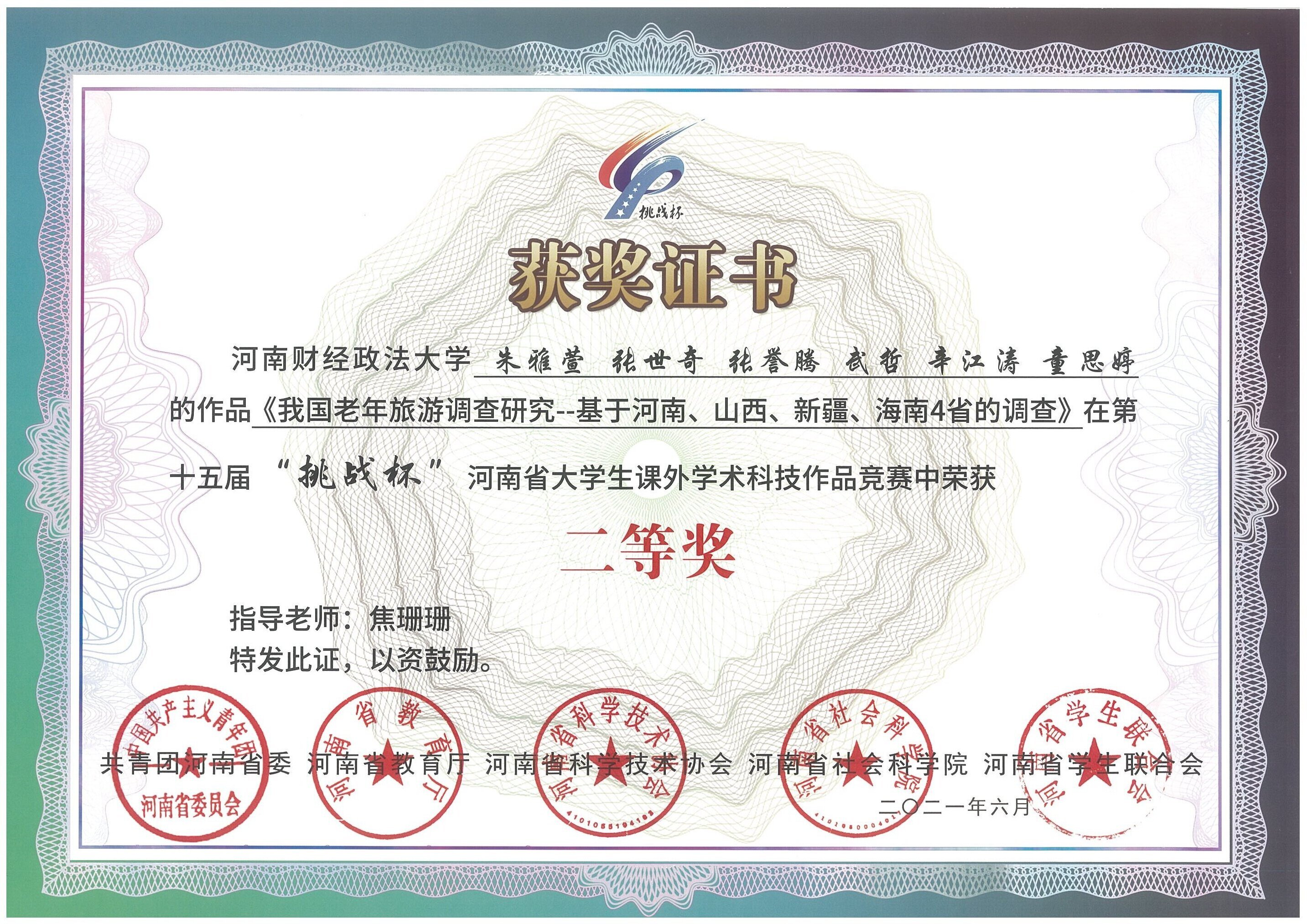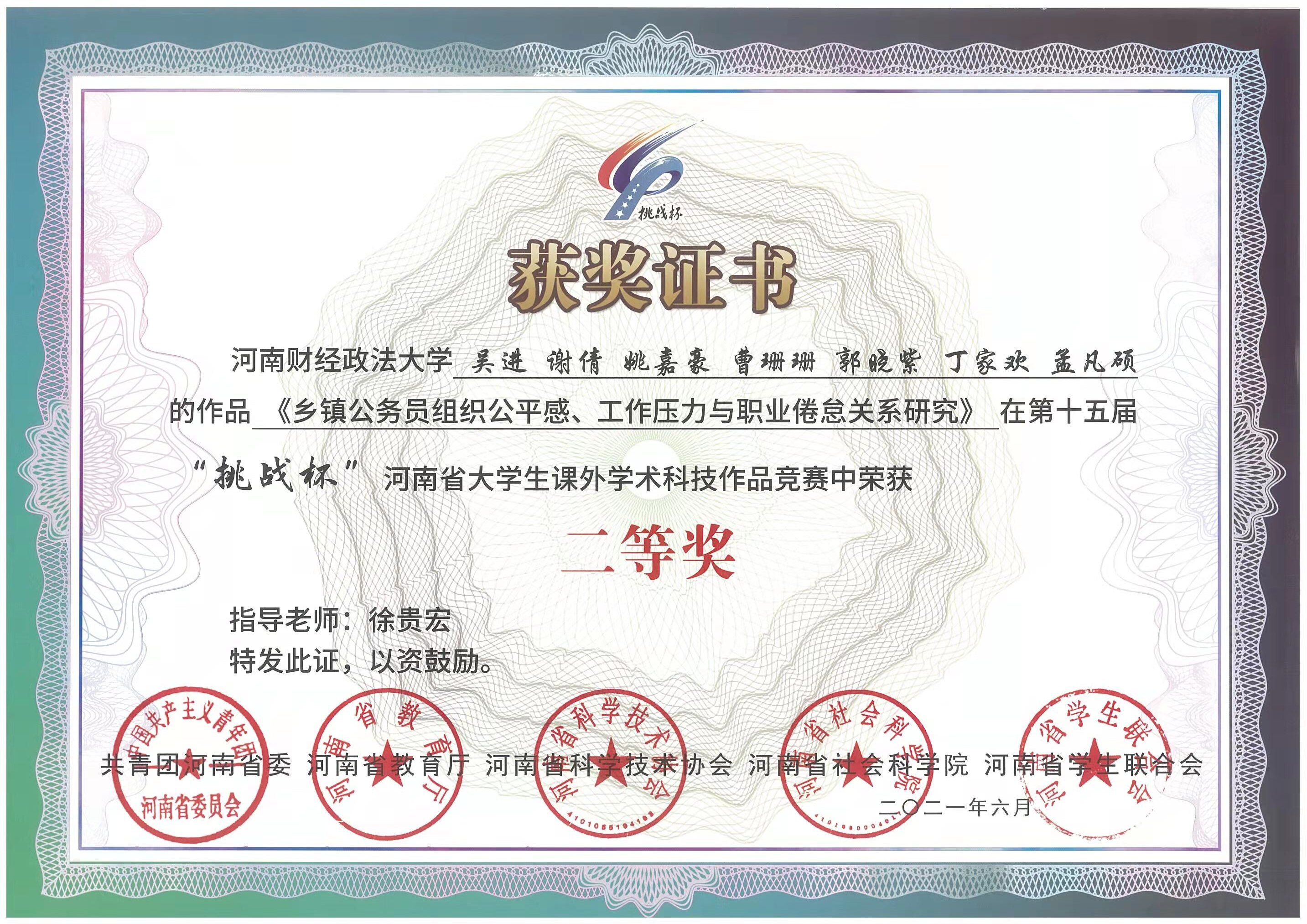 2021年6月,由我院徐贵宏院长指导的作品《乡镇公务员组织公平感、工作压力与职业倦怠关系研究》、焦珊珊老师指导的作品《我国老年旅游调查研究—基于河南、山西、新疆、海南四省的调查》,双双荣获第十五届“挑战杯”河南省大学生课外学术科技作品竞赛省级二等奖。