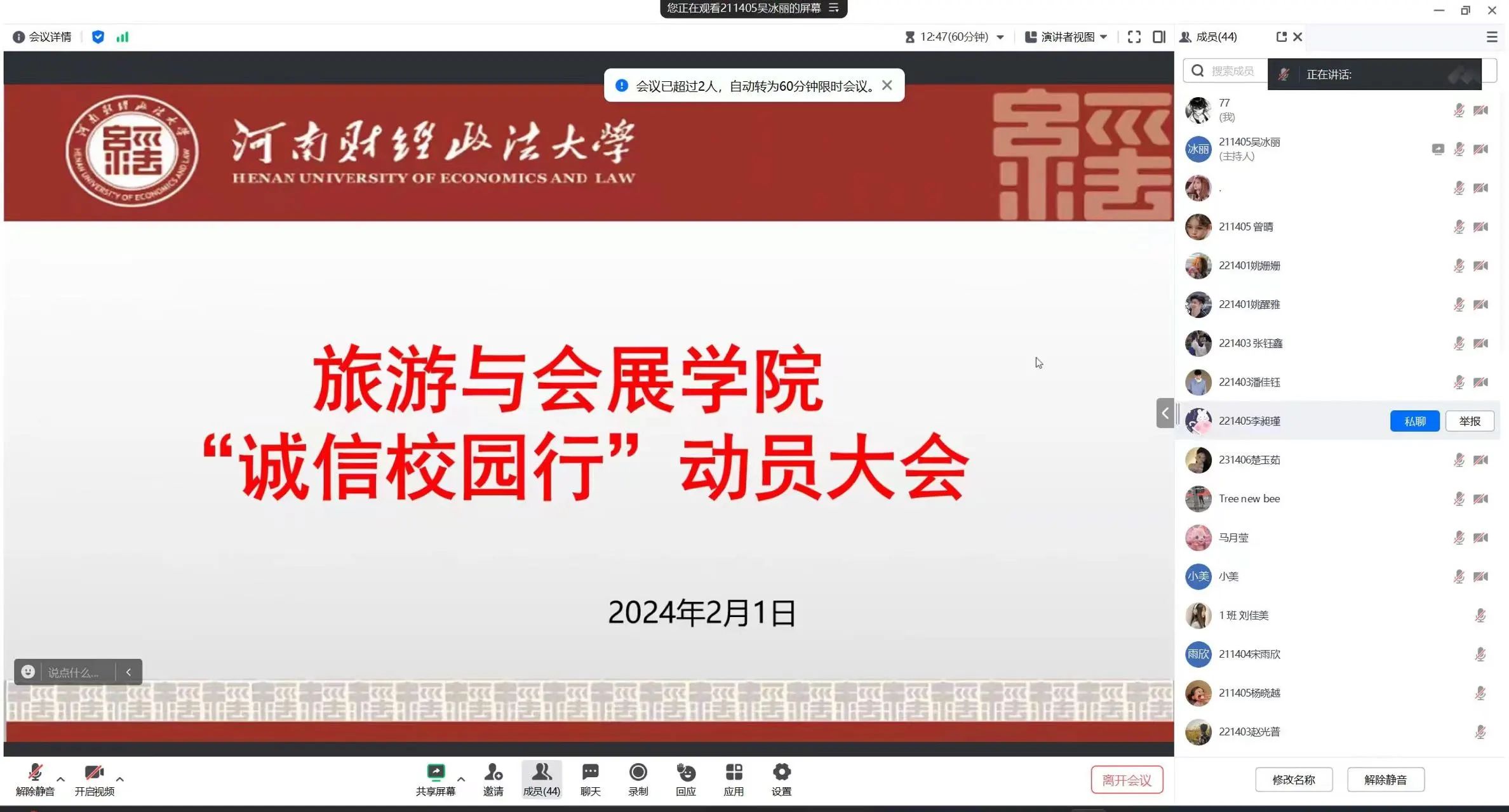 为推进诚信教育、感恩教育、励志教育,旅游与会展学院于2月1日在腾讯会议召开“诚信校园行”比赛动员大会。会议由学生杨晓越、吴冰丽主持,2021-2023级各班班委参加此次会议。