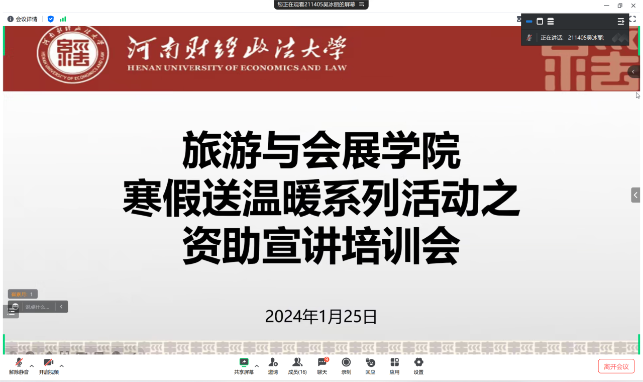 为能更好落实国家资助政策,1月26日,旅游与会展学院于线上召开资助宣讲培训会议。我院国家励志奖学金获得者参加会议,学生吴冰丽担任主持人。