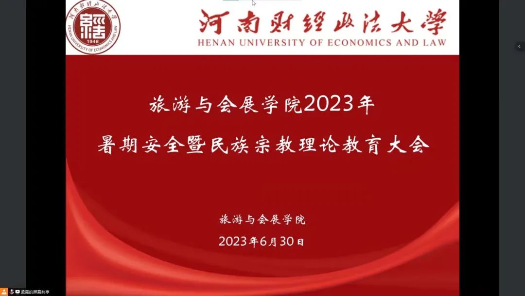 6月30日,旅游与会展学院于腾讯会议召开2023年暑期安全暨民族宗教理论教育大会,会议由学院团委副书记马超主持,我院全体学生参与此次会议。