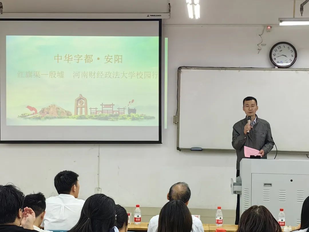 会上,赵现红对于“中华字都·安阳”文化旅游校园行表示热烈欢迎,并对同学们投身于蓬勃发展的文化旅游事业表示热切期盼。随后,和晓勇作为校友深情回忆了在我校读书的岁月,并隆重推介了红旗渠精神和殷墟文化,热情欢迎学弟学妹们兴业安阳。接着,红旗渠纪念馆副主任常会平向大家讲解了红旗渠精神背后的历史故事和现实意义。红旗渠精神的内涵是“自力更生、艰苦创业、团结协作、无私奉献”,是在修建红旗渠的过程中形成的。红旗渠精神是奋斗者的精神,是不畏艰难,迎难而上的吃苦精神。她指出,未来,年轻人需要继承和发扬吃苦耐劳的精神,摒弃娇骄,扎根实际。最后,殷墟博物馆宣传科副科长杨艳梅向大家介绍了殷墟文化及甲骨文。殷墟文化是中国历史上最早的青铜文化,也是世界上最古老的青铜文化之一。在这个时期,青铜器在社会经济、政治、文化等方面发挥了重要的作用。杨艳梅还向大家介绍了殷墟出土的甲骨文,加深了同学们对甲骨文和中国文字的理解。