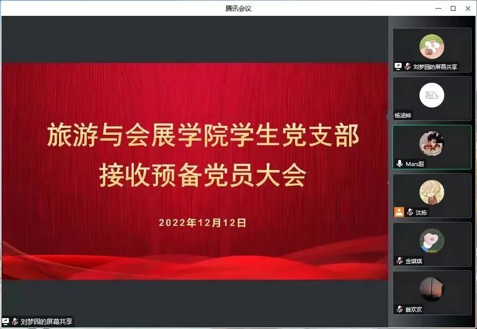 12月12日,旅游与会展学院学生党支部于腾讯会议召开接收预备党员大会,全体发展对象以及学生党支部成员到场参加,学院团委副书记马超担任主讲人,学生沈栋担任主持人。
