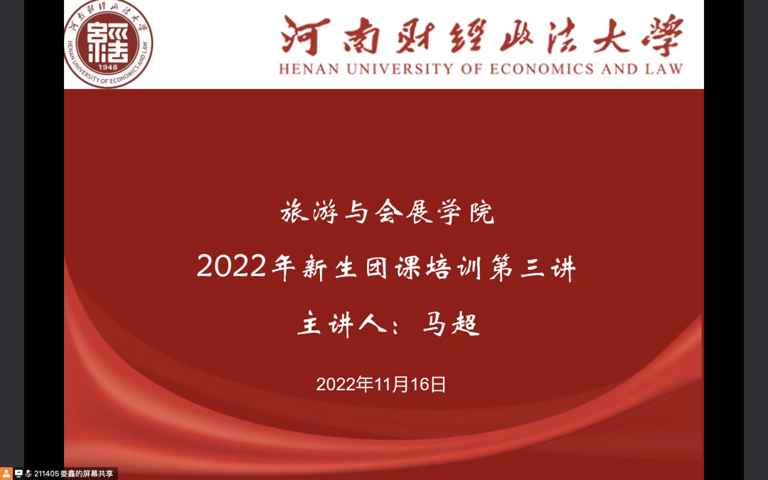 11月16日,旅游与会展学院于腾讯会议开展2022级新生团课培训第三讲。2022级全体学生参加此次培训,团委副书记马超担任主讲人。