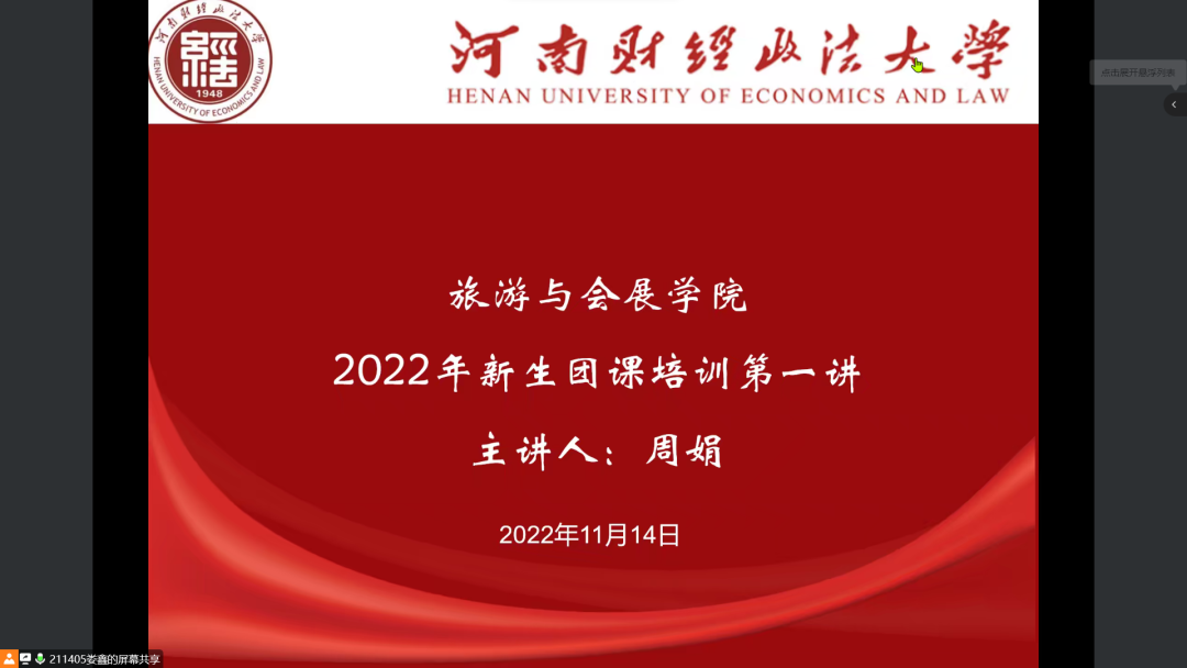 11月14日,旅游与会展学院于腾讯会议开展2022级新生团课培训第一讲。2022级全体学生参加此次培训,学生周娟担任主讲人。
