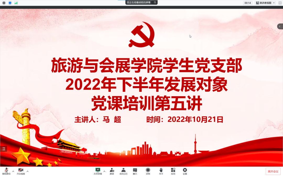 10月21日,旅游与会展学院于腾讯会议开展2022年下半年发展对象党课培训第五讲。全体发展对象参会,我院团委副书记马超担任主讲人。