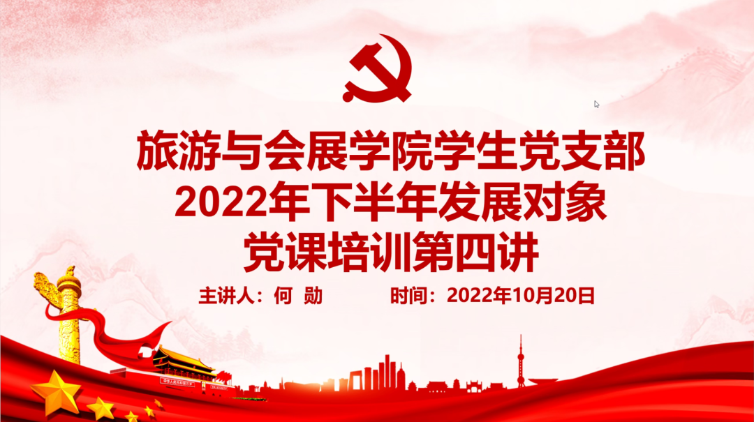10月20日,旅游与会展学院于腾讯会议开展2022年下半年发展对象党课培训第四讲。全体党员发展对象参会,我院副院长何勋担任主讲人。