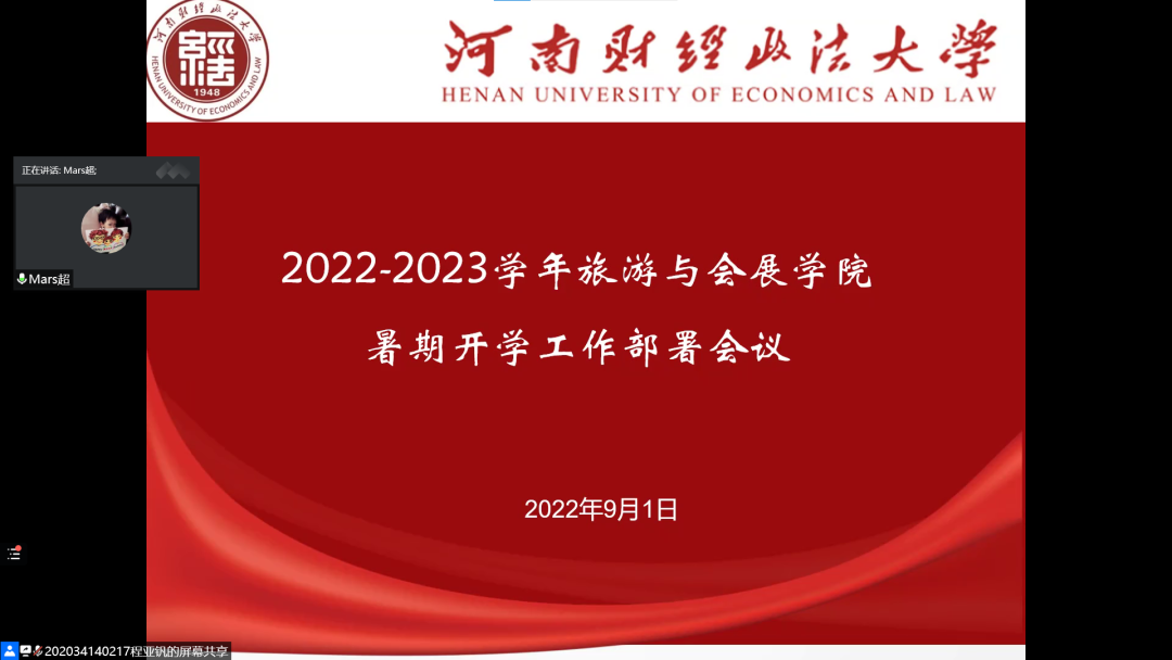 9月1日,旅游与会展学院于腾讯会议召开2022—2023学年暑期开学工作部署会议。学院团委书记蔡萌、团委副书记马超担任主讲人,学院全体学生参加会议。