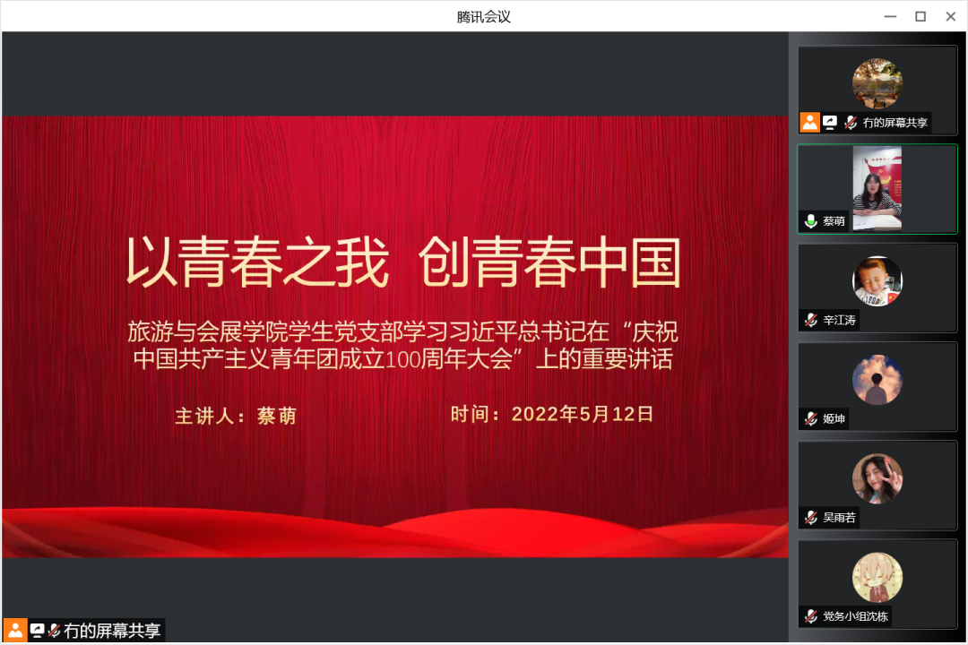 5月12日,旅游与会展学院学生党支部于腾讯会议开展“以青春之我,创青春中国”主题党日活动,学生党支部书记蔡萌担任主讲人,党支部成员参会。
