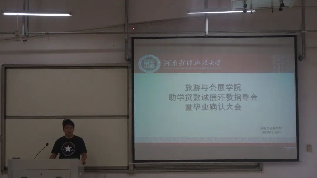 5月3日,旅游与会展学院于教学科研楼104教室召开助学贷款诚信还款指导会暨毕业确认大会。学院党委副书记王莹、团委书记蔡萌、团委副书记马超出席会议,学生郭腾担任主讲人,2022届毕业生到场参加。