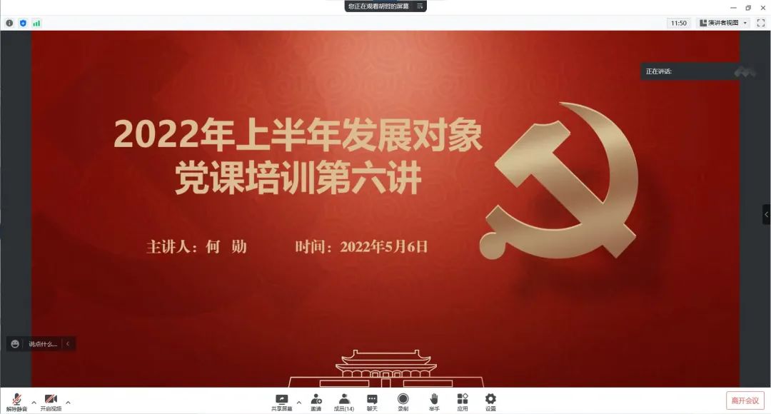 5月6日,旅游与会展学院于腾讯会议开展2022年上半年发展对象党课培训第六讲,学院副院长何勋担任主讲人,全体发展对象到场参加。
