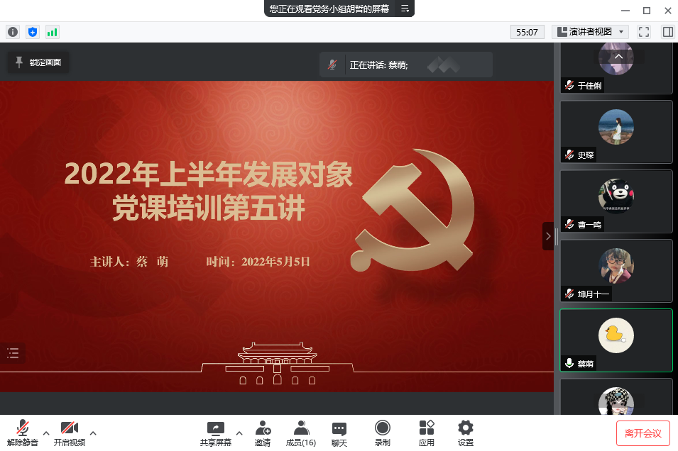5月5日,旅游与会展学院于腾讯会议开展2022年上半年发展对象党课培训第五讲,学院团委书记蔡萌担任主讲人,全体发展对象参加会议。