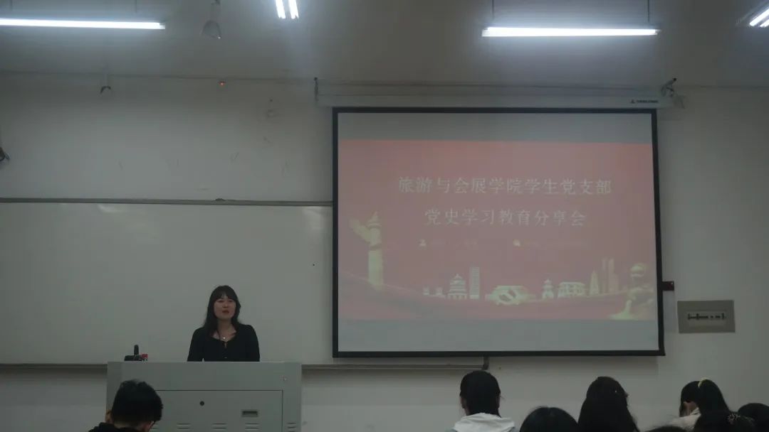 4月21日,旅游与会展学院学生党支部于教学科研楼115教室召开党史学习教育心得分享会,学生党支部书记蔡萌担任主讲人,党支部成员到场参加。