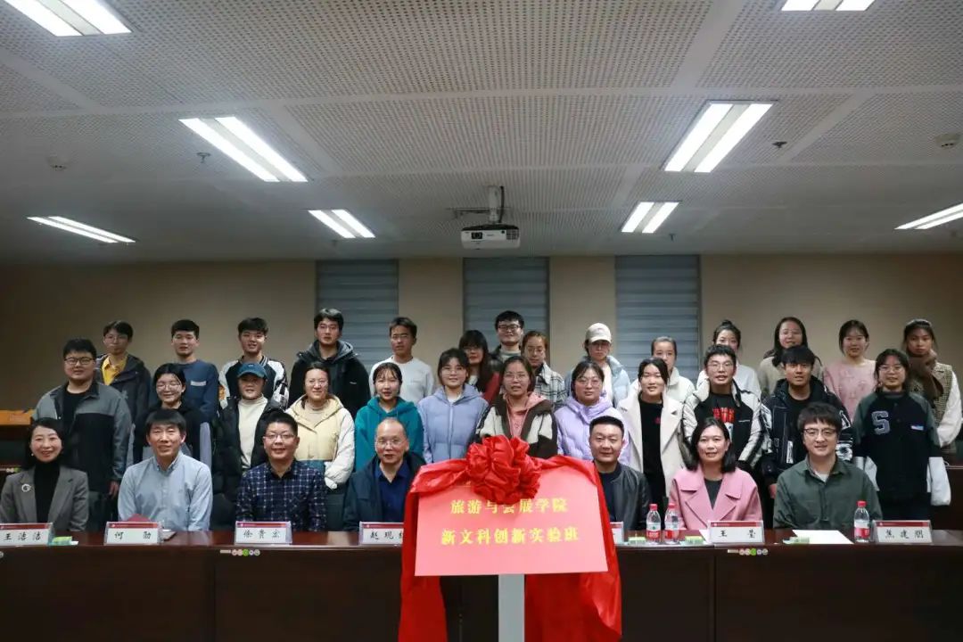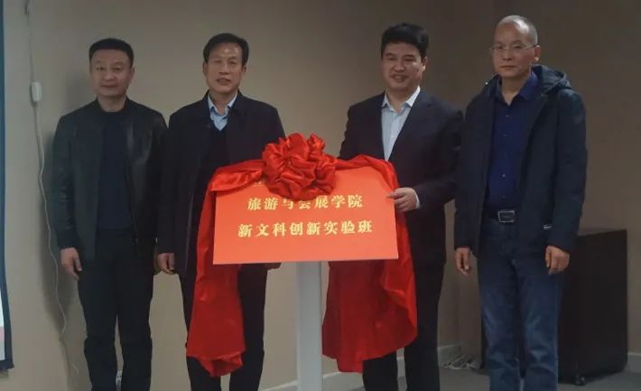 刘荣增宣布旅游与会展学院“新文科创新实验班”开班,与张道庆处长、赵现红院长共同为创新实验班揭牌。
