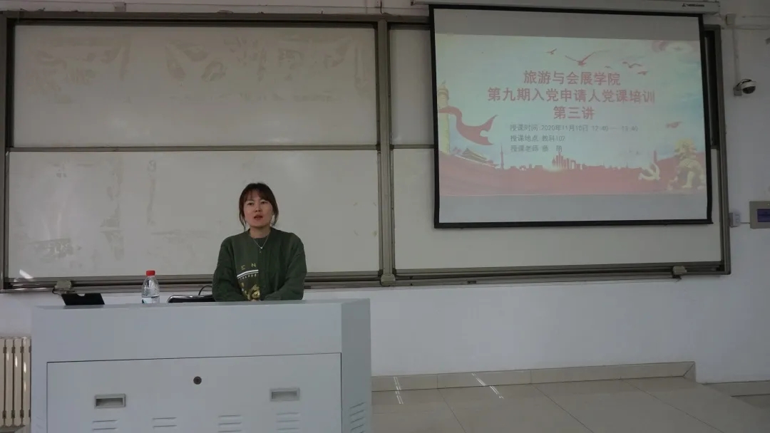 11月10日,旅游与会展学院在教学科研楼102教室召开第九期入党申请人党课培训第三讲,学院党支部书记蔡萌担任主讲人,第九期入党申请人到场参加。