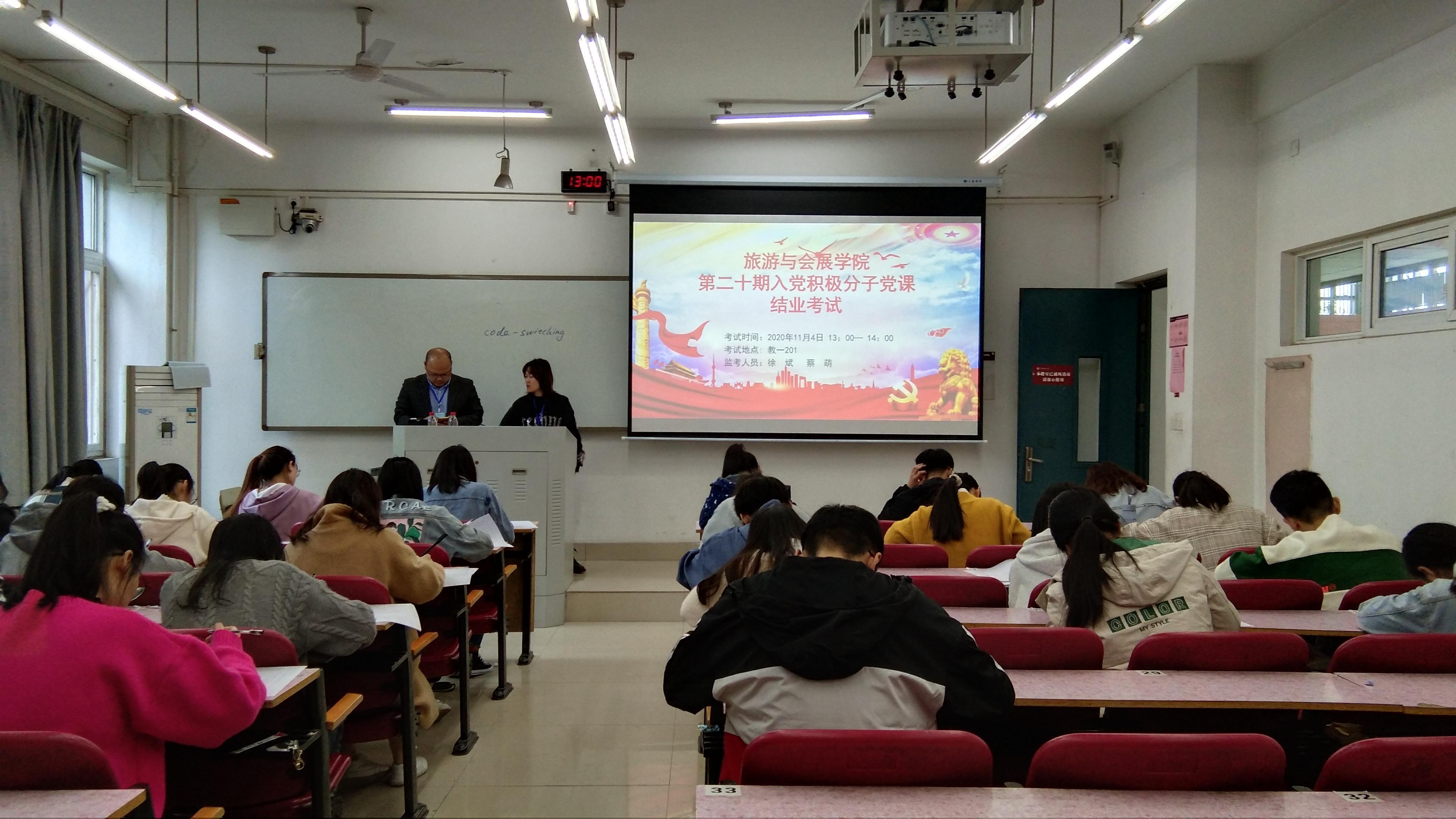 为了加强入党积极分子的政治理论知识学习,确保入党积极分子的发展质量,11月4日,旅游与会展学院在第一教学楼201教室开展第二十期入党积极分子党课结业考试,学院党委副书记徐斌、团委书记蔡萌担任监考老师,第二十期入党积极分子到场参加。