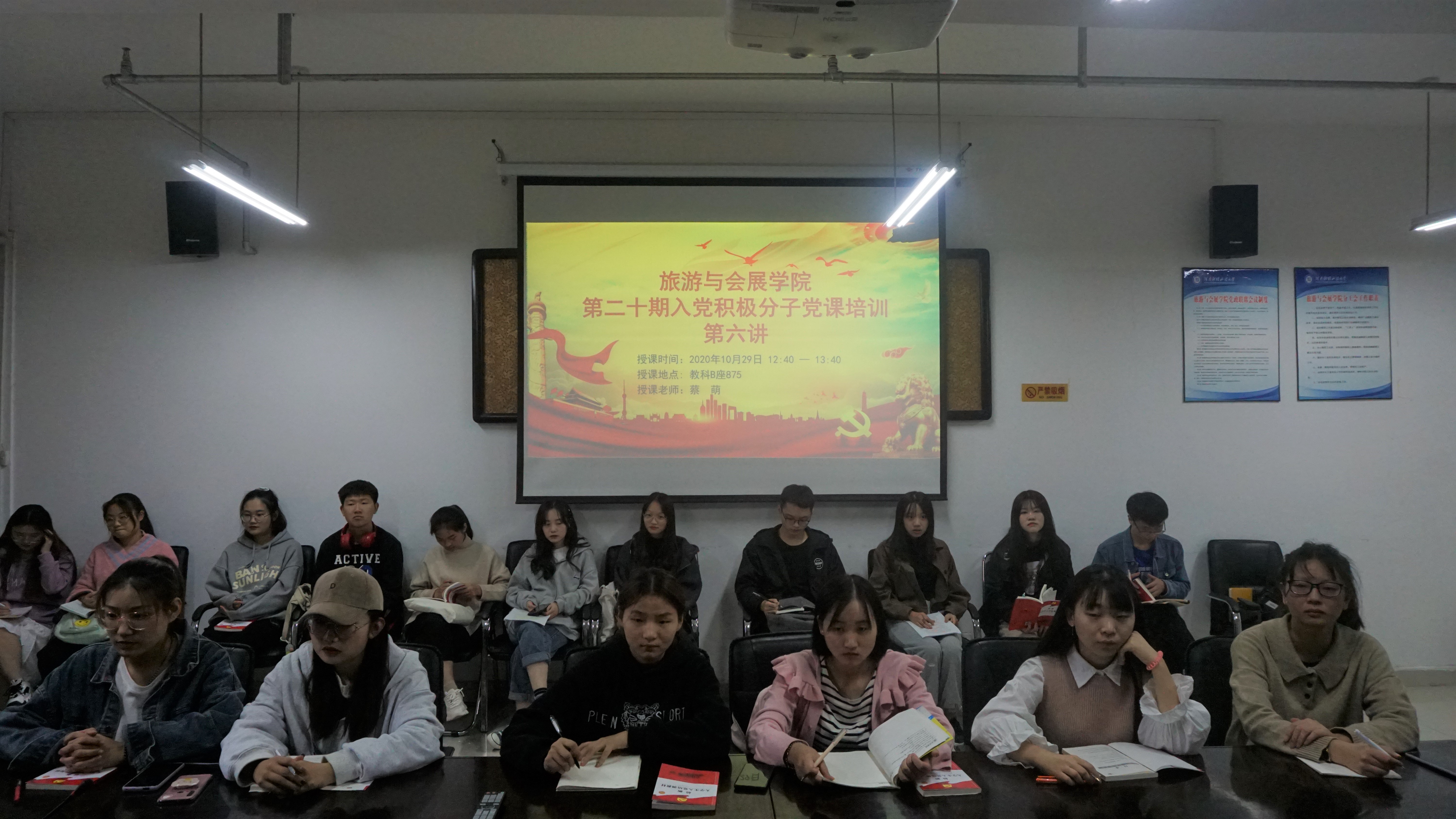 10月29日,旅游与会展学院在教学科研楼875会议室召开第二十期入党积极分子党课培训第六讲,学院学生党支部书记蔡萌担任主讲人,第二十期入党积极分子到场参加。