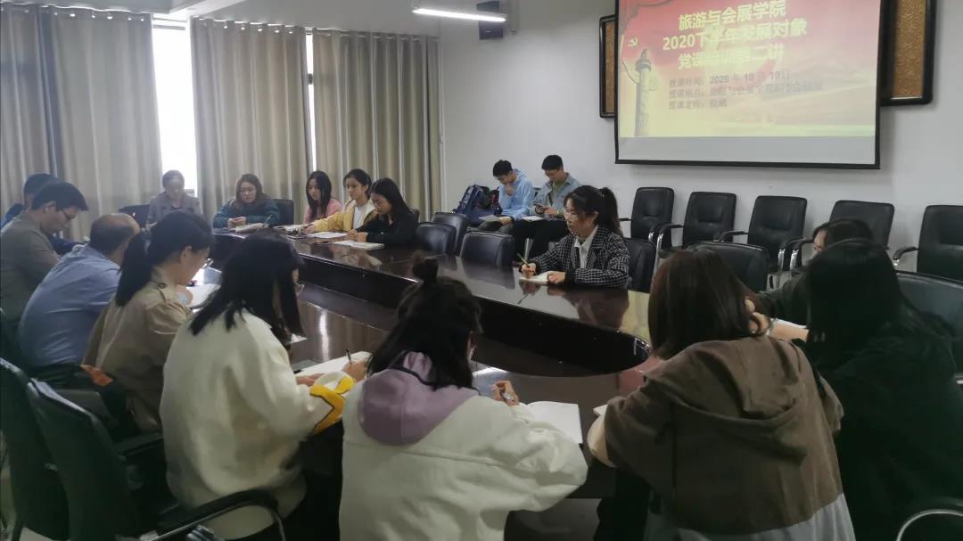 10月19日,旅游与会展学院于教学科研楼875会议室召开2020年下半年发展对象党课培训第二讲,学院党委副书记徐斌担任主讲人,全体发展对象到场参加。