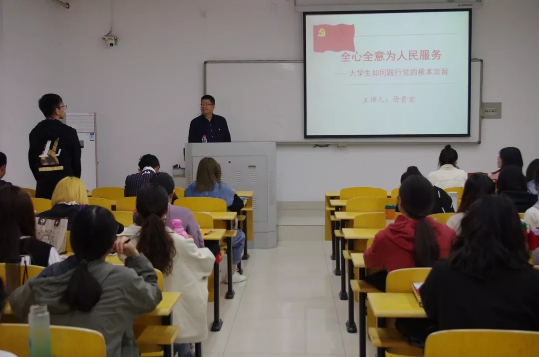 会上,徐贵宏以“全心全意为人民服务”作为本次授课的主题,围绕大学生如何践行党的宗旨进行深入地讲解,并让同学们观看张思德、白求恩、黄旭华、焦裕禄等同志的英雄事迹,深入学习他们无私奉献、艰苦奋斗的精神,在心中树立优秀的榜样。会中,他引经据典,用“鞠躬尽瘁,死而后已”来形容共产党员为人民服务的坚定信念,他强调要做到“三个坚持”,坚持立党为公,执政为民;坚持抓好发展党执政兴国的第一要务;坚持拒腐防变,始终保持清正廉洁;并重点讲述了习近平同志深入百姓生活、查看民情、与百姓同吃住等故事,为同学们指明了服务对象和前进路线。他希望同学们秉持初心、牢记使命,用震撼人民灵魂的精神来服务人民,建设伟大祖国。