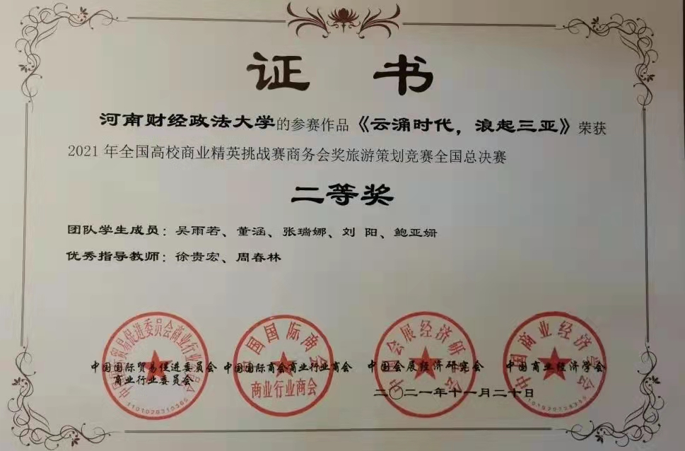 董涵同学在学习过程中,曾多次参加“挑战杯”、“互联网+”、“三创赛”等各类创新创业类比赛,并于2021年11月获得全国高校商业精英挑战赛商务会奖旅游策划竞赛二等奖。她表示,在比赛的过程中收获满满,不仅提高了创新思维和实践能力,也能更好地将知识付诸于实践。