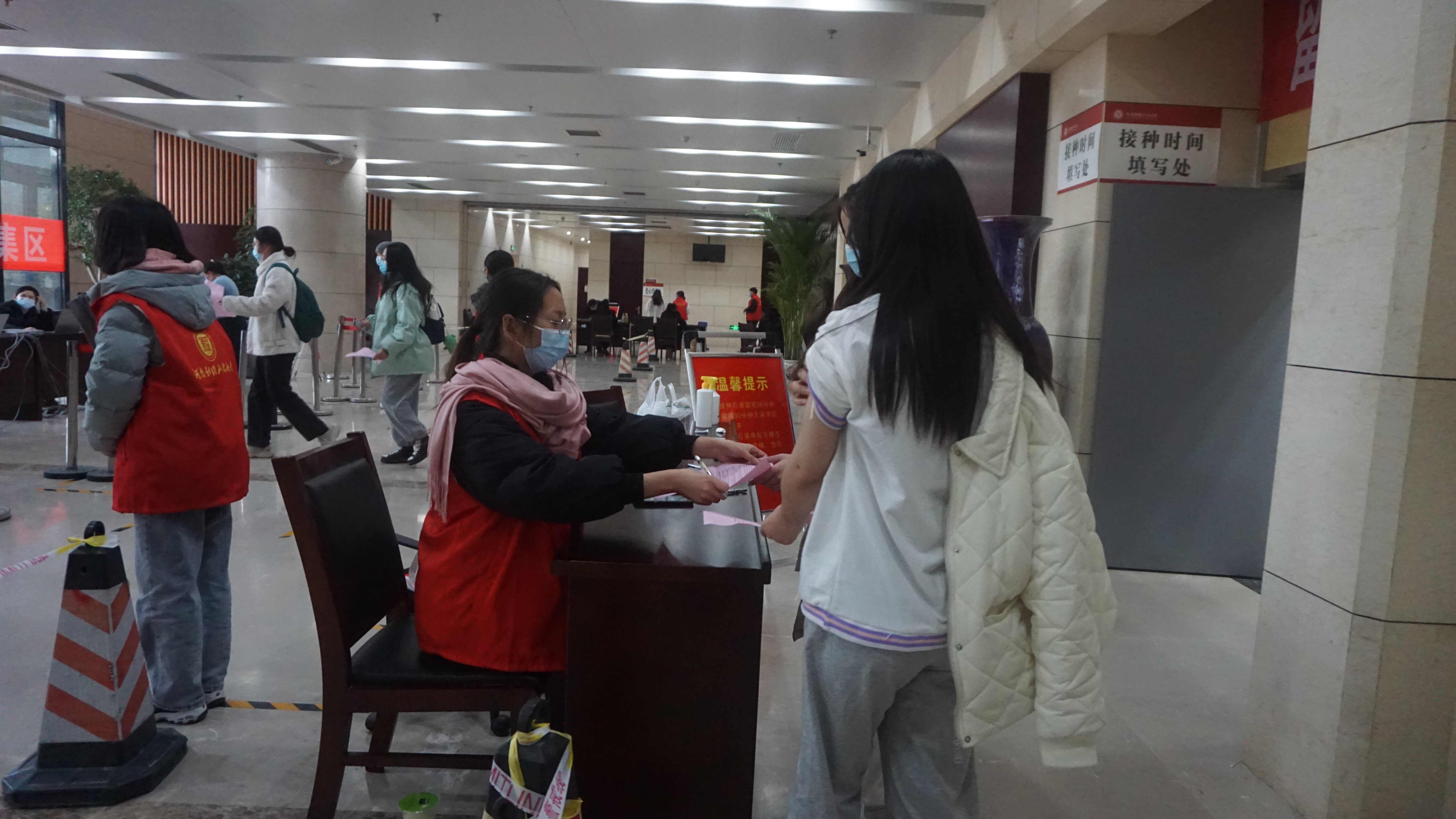 12月28日,旅游与会展学院积极组织学生在图书馆报告厅参加疫苗加强针接种志愿服务活动。