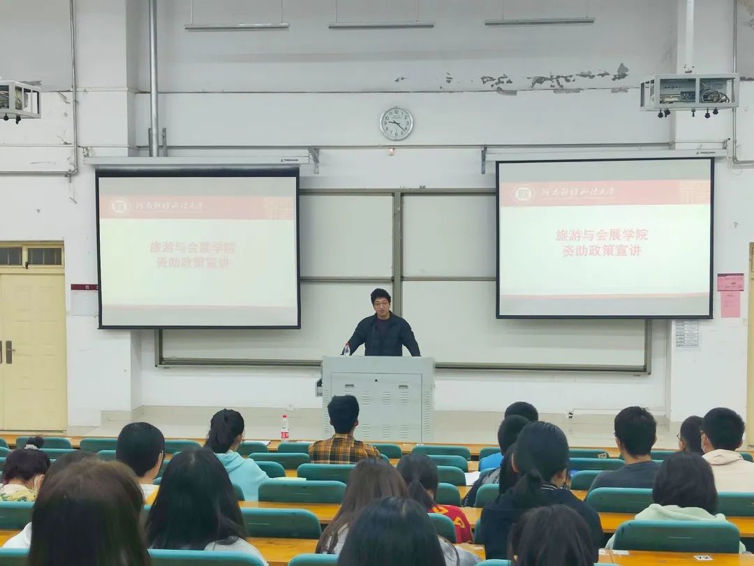 11月26日,旅游与会展学院于教学科研楼209教室召开资助政策宣讲会,学院团委副书记马超出席并主持会议,2021级全体新生到场参加。
