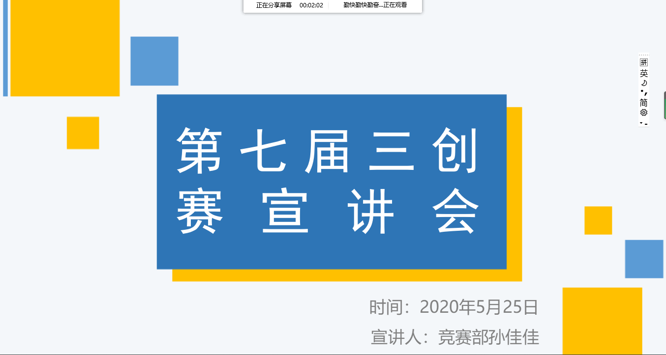5月25日,旅游与会展学院通过腾讯会议平台召开第七届三创赛宣讲会。学院团委书记蔡萌出席会议,学生孙佳佳担任主讲人,我院学生线上参会。