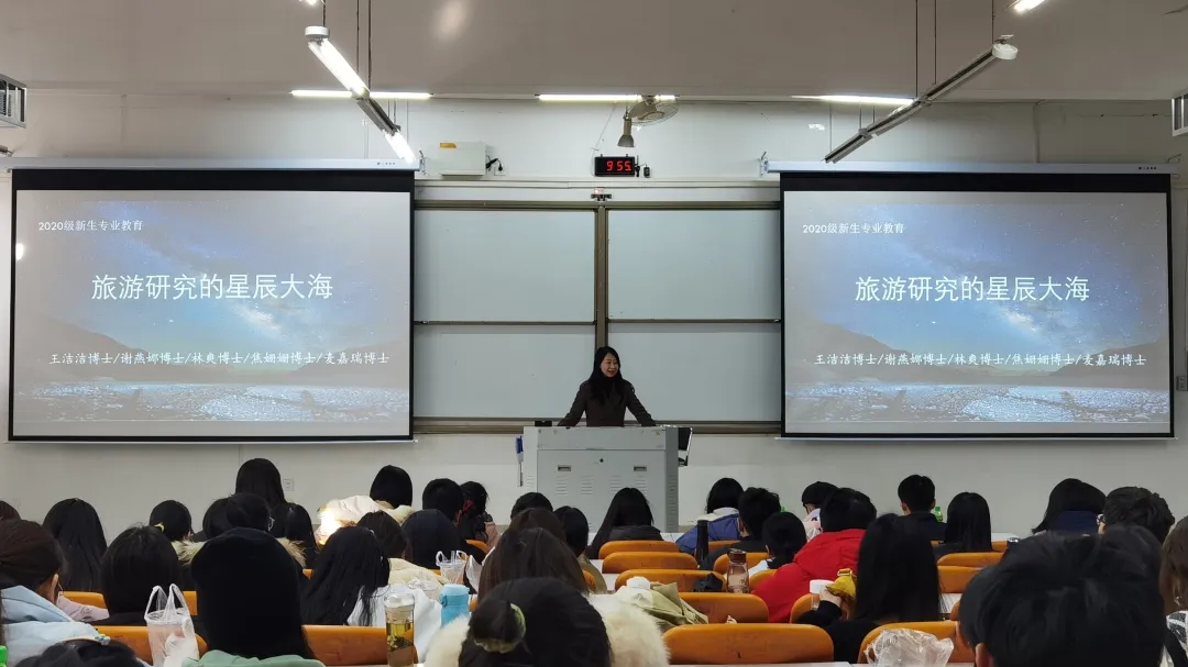 为使2020级学生更好地了解行业发展现状,做好职业规划,强化自我发展意识,12月14日,旅游与会展学院在第一教学楼116教室开展新生专业教育之《旅游研究的星辰大海》主题讲座,邀请到学院专业教师王洁洁、谢燕娜、林爽、焦珊珊和麦嘉瑞进行讲解授课,副院长徐贵宏出席讲座,2020级全体同学到场参加。