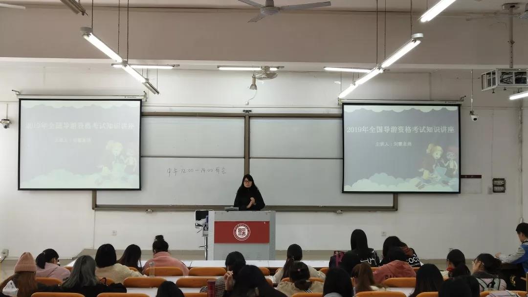 11月25日,旅游与会展学院于第一教学楼116教室召开2019年全国导游资格考试知识讲座,学院专业教师刘慧出席并担任主讲人,各年级学生自主参加。