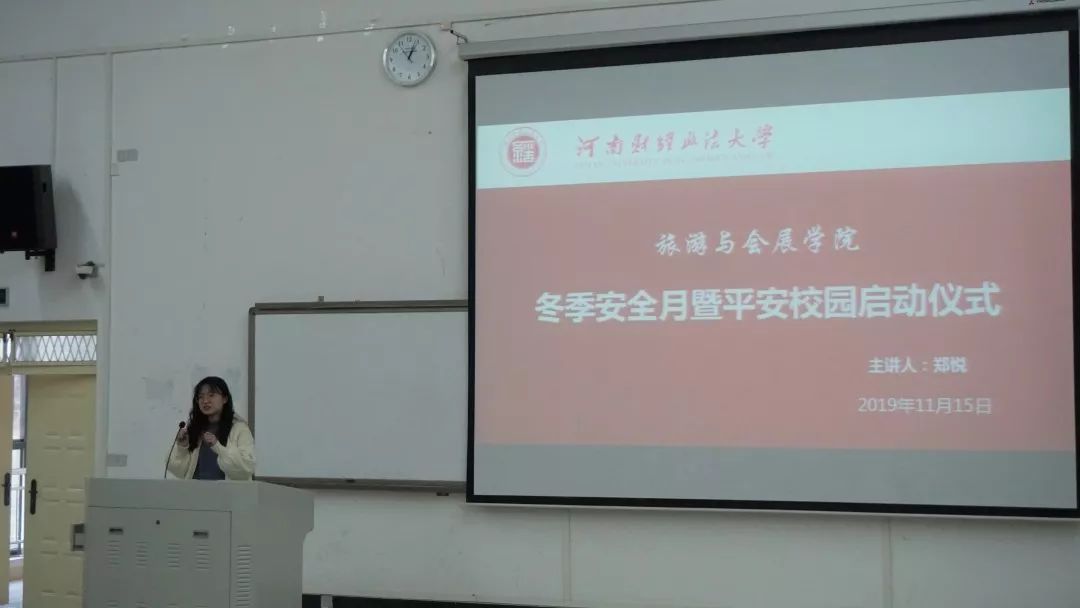 11月15日,旅游与会展学院于建树楼B座101教室举行冬季安全月暨平安校园启动仪式,学生会主席郑悦担任主讲人,学院主要学生干部及2019级新生到场参加。