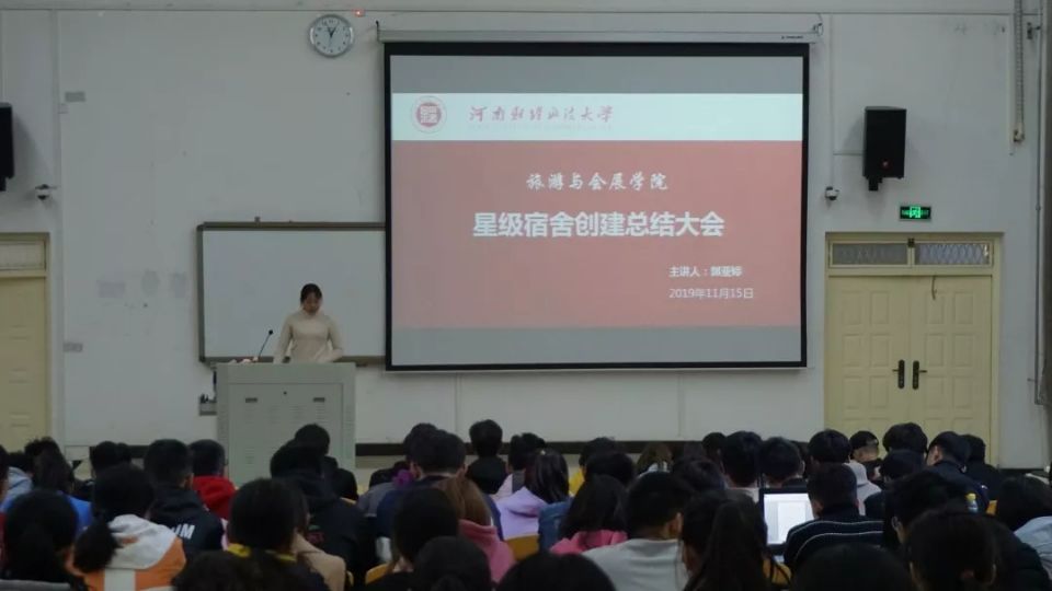 11月15日,旅游与会展学院于建树楼B座101教室召开星级宿舍创建总结大会。学生会副主席郭亚婷担任主持人,学院主要学生干部及2019级全体学生到场参加。