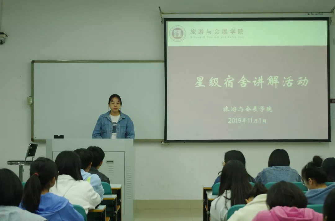 11月1日,旅游与会展学院于第二教学楼103教室开展星级宿舍讲解活动。活动由学生会副主席郭亚婷主持,学院主席团成员担任评委,2019级班委及寝室长到场参加。