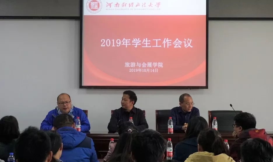 10月14日,旅游与会展学院在教学科研楼727会议室召开2019年学生工作会议,学院党委书记汪国强、院长赵现红、党委副书记徐斌出席会议,团学工作专兼职辅导员、主要学生干部参加会议。