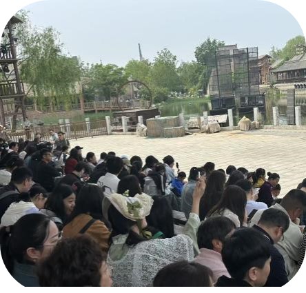 抵达后,同学们在研学导师的引导下,参观了电影大道和太极街等主题街区,感受老郑州的商埠风情,领略到传统太极文化与电影艺术结合的奇妙,感受到非遗文化的独特魅力。大家还观看了《刺杀行动》《无极之极》等沉浸式演出,参与《戏精请就位》《一路有戏》等沉浸式互动节目,大家被这些精彩的表演深深吸引,深刻感受到了电影小镇独特的文化魅力。在与景区工作人员的交流中,同学们积极提问,深入了解了电影小镇的运营模式、市场定位、营销推广以及人才需求等方面的情况。
