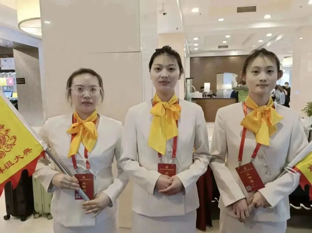 癸卯年黄帝故里拜祖大典以“同根同祖同源,和平和睦和谐”为主题,先后进行“盛世礼炮、敬献花篮、净手上香、行施拜礼、恭读拜文、高唱颂歌、乐舞敬拜、祈福中华、天地人和”9项仪程,彰显中华传统礼仪文化,向世界庄严传递中华民族的优秀传统、美好愿景。我院三名学生在院系选拔中脱颖而出,并进行了为期一周的集中培训,积极承担起活动的讲解服务工作。在活动中,我院学生行为举止大方,衣着大气得体,为各位来宾讲解华夏文明的深厚内涵,充分展现出自己的专业优势,同时,我院学生的优秀表现,得到了来宾的高度赞誉,其中一位来宾现场提字,对我院讲解员的的优秀表现进行褒奖,这也是对我院学生的专业肯定以及鼓励。