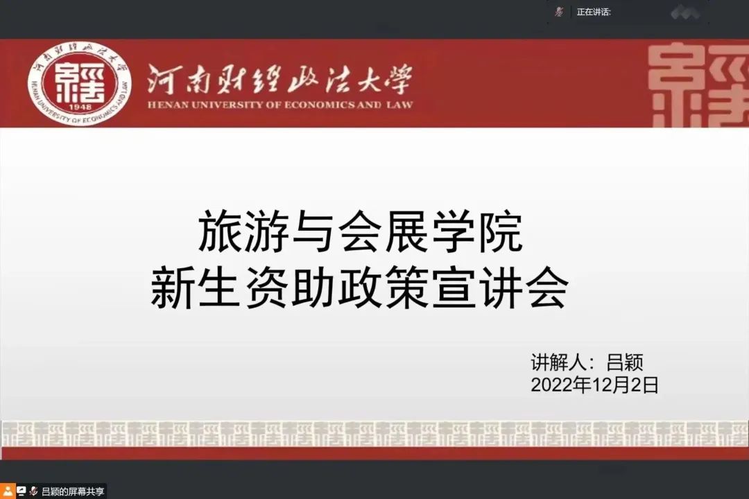 12月2日,旅游与会展学院于腾讯会议召开新生资助政策宣讲会。学院团委副书记马超出席会议,2022级全体新生参会,学生吕颖担任主持人。