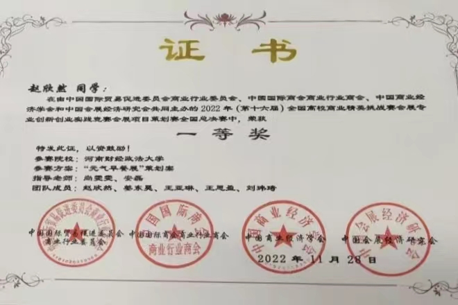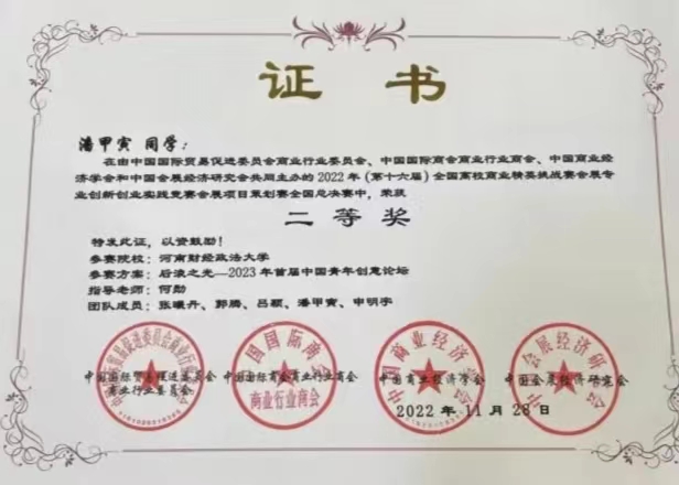 本次比赛由中国国际贸易促进委员会商业行业委员会、中国国际商会商业行业商会、中国商业经济学会、中国会展经济研究会共同主办。比赛分为会展项目策划赛、数字会展项目策划赛、会展城市菅销策划赛、会展项目调研赛、会展项目设计赛和现场管理及沙盘布局竞赛等6个赛项。我院学生在辅导老师的悉心指导下,不断改善作品内容,展现创新思维,“品食人间味,包容天下香—2023中国(郑州)元气早餐展览会”、“后浪之光--2023年首届中国青年创意论坛”两部作品从全国众多优秀作品中脱颖而出,喜获佳绩。