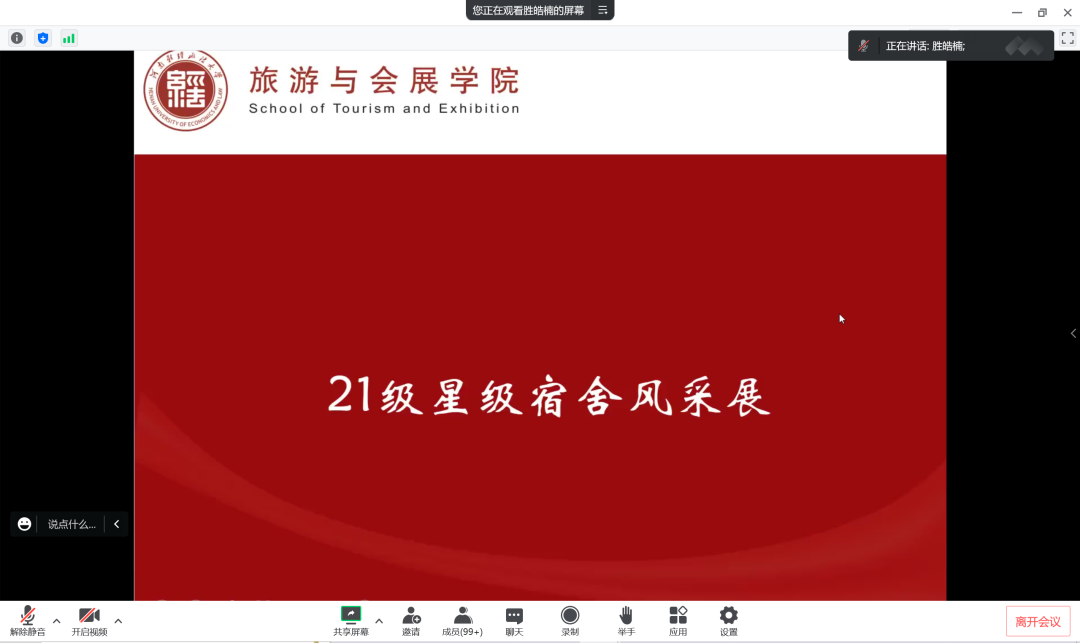 为了营造良好宿舍氛围,创建优美的宿舍环境,10月17日,旅游与会展学院于腾讯会议召开星级宿舍动员大会。2021级各班班委及2022级全体学生参会,学生胜皓楠担任主持人。