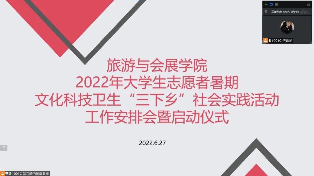 6月27日,旅游与会展学院于腾讯会议召开2022年大学生志愿者暑期文化科技卫生“三下乡”社会实践活动工作安排会暨启动仪式。学院团委书记蔡萌出席会议,学生贺希梦担任主持人,2022年暑期社会实践团队全体成员参会。