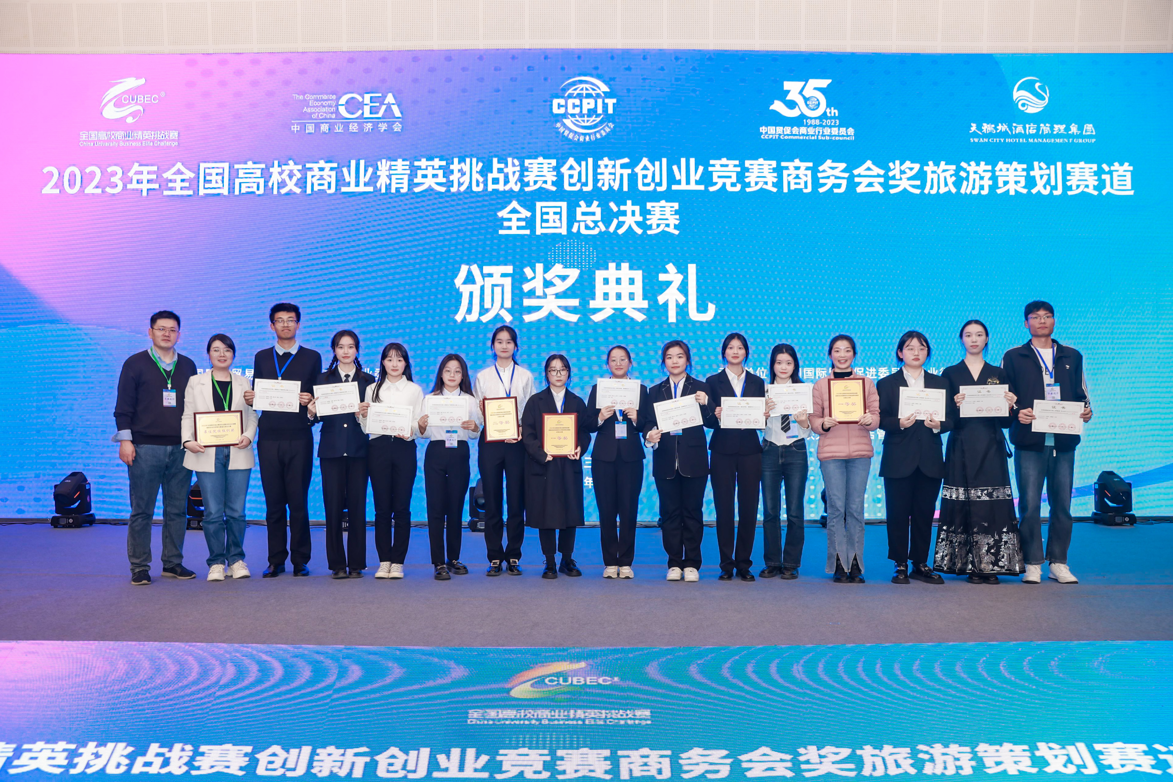 本次赛事由中国贸促会商业行业委员会、中国国际商会商业行业商会和中国商业经济学会共同主办,共分为初赛和决赛两个竞赛环节。初赛阶段,在我院老师的指导下,学院三支队伍通过团队合作,凭借出色的策划能力和创新思维,从众多参赛队伍中脱颖而出进入决赛。在决赛的展示陈述与答辩环节,学院学生充分运用所学的专业知识与日常实践的经验,大方得体、从容不迫地展示策划方案、回答评委的问题。最终,我院的“说的都队” “漫界策划小组” “小葵花向阳队” 三支队伍分别获得了大赛的一等奖、一等奖和二等奖。