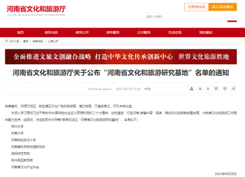 8月28日,河南省文化和旅游厅关于公布“河南省文化和旅游研究基地”名单,我校榜上有名。河南省文化和旅游研究基地是为深入推进文化旅游融合发展战略,加快塑造“行走河南·读懂中国”品牌,推动文化旅游高质量发展,为我省文化和旅游工作提供高质量决策咨询服务和智力支持而专门设立的。