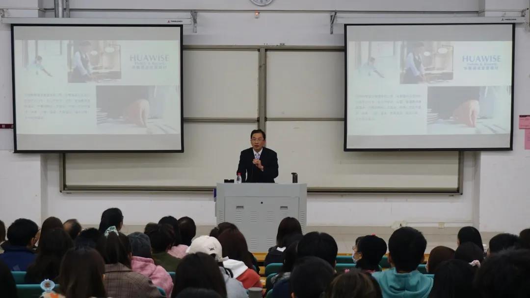 课上,何军辉首先对酒店概况、酒店文化、产业项目、行业定位、产品设计等方面进行了介绍,他结合个人学习和工作经历传授酒店管理行业的经验,对酒店的发展前景进行了科学合理的规划,并与在场学生进行互动探讨,提供就业方向及人生规划建议。随后,他通过对近十五年中国酒店行业发展数据、国内外政策形势与行业发展环境的分析,帮助在场学生深刻认识中国酒店业的现状与前景。最后,廖晓静表示,当代大学生应正确处理课堂知识与社会实践的关系,用端正的态度点燃未来职业道路的明灯。