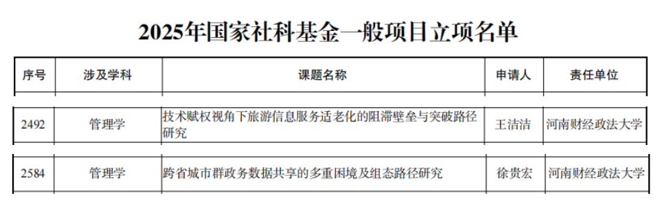 9月5日,全国哲学社会科学工作办公室发布《关于2025年国家社会科学基金年度项目立项名单的公示》。我院王洁洁、徐贵宏两位博士获批立项一般项目。至此,继2024年获批国家自科基金项目一项,我院在国家级课题立项上更进一步,持续为管理学部高质量发展注入强劲动能。